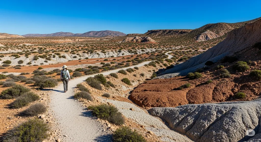 El inicio de este camino es único. Las primeras etapas llevan al peregrino a través del Desierto de Tabernas, un paisaje sobrecogedor de cárcavas y ramblas áridas, famoso en el siglo XX por ser el escenario de cientos de películas del género "spaghetti western". Superado el desierto, la ruta se enfrenta a un obstáculo formidable: la cordillera de Sierra Nevada. El camino asciende por su vertiente norte, a través de la comarca de los Filabres, y pasa por villas como Fiñana antes de llegar a la histórica ciudad de Guadix, célebre por su catedral y, sobre todo, por su barrio de cuevas, donde miles de personas aún viven en viviendas trogloditas.