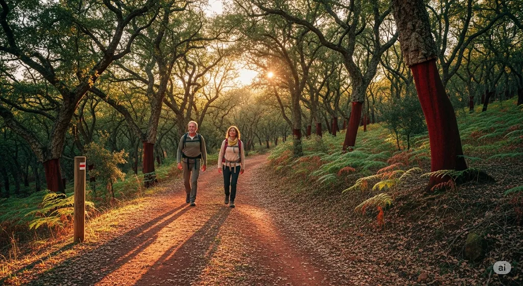 El tramo más espectacular es el cruce del Parque Natural Sierra de Aracena y Picos de Aroche. Aquí, el paisaje se transforma en un terreno montañoso y frondoso, un mosaico de bosques de encinas, alcornoques y castaños que conforman la dehesa, el ecosistema donde se cría el cerdo ibérico. El camino pasa por la capital de la comarca, Aracena, famosa por su castillo y, sobre todo, por la Gruta de las Maravillas, una espectacular cueva subterránea.